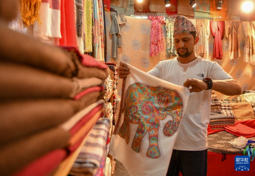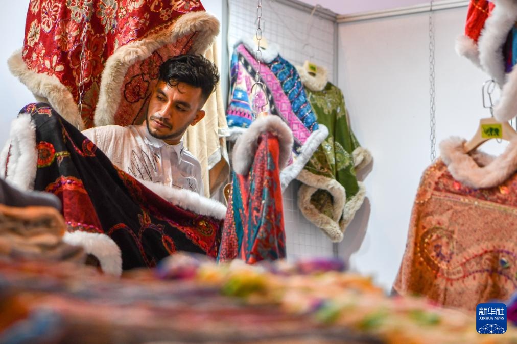 6月18日,来自尼泊尔的参展商整理即将展出的特色服饰。