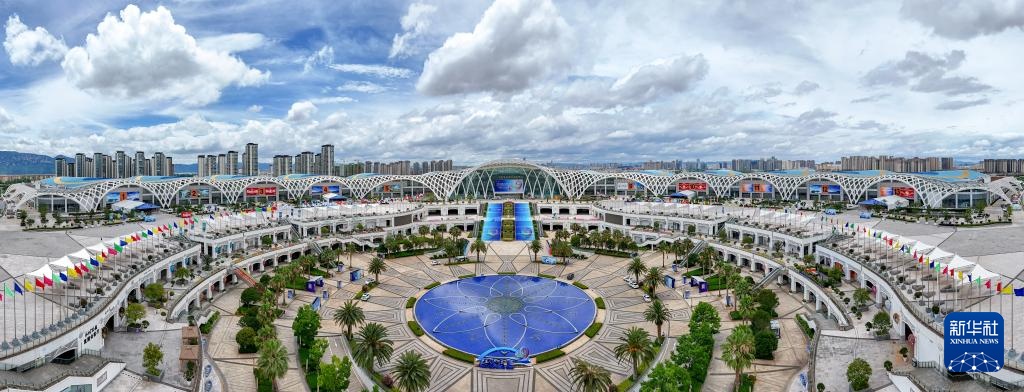 6月18日拍摄的第9届中国—南亚博览会举办地昆明滇池国际会展中心(无人机全景照片)。