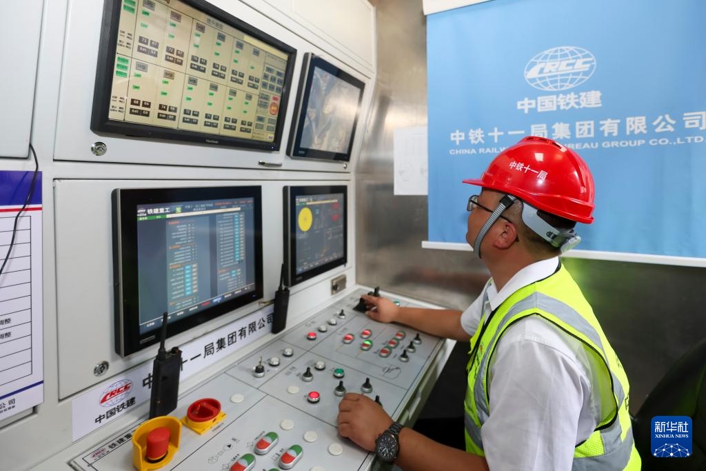 6月18日,作业人员在调试竖井掘进机配套设施。