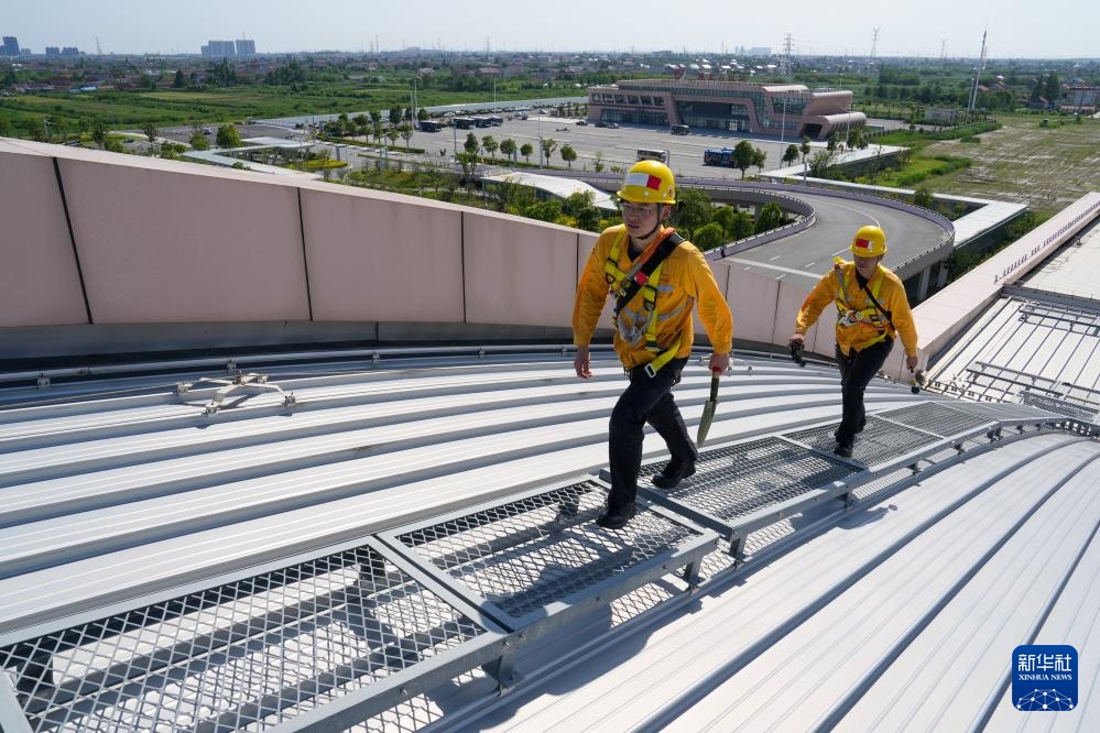 6月18日,工作人员在宁启铁路启东站进行站房屋面高空巡检。