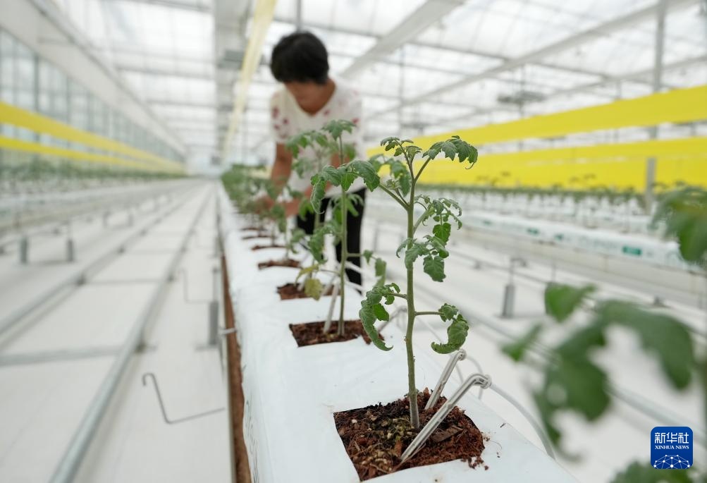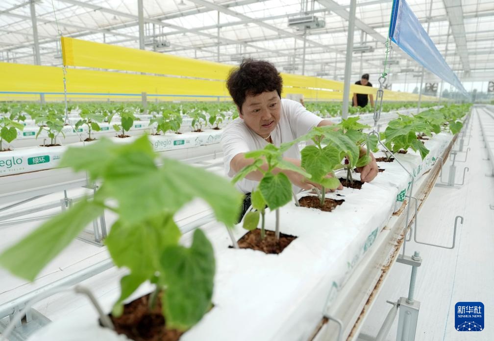 6月19日,农民在河北省卢龙县木井镇蔬菜种植基地的智能温室内管护蔬菜。