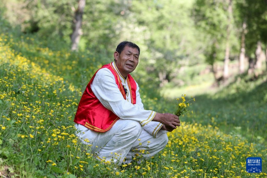 6月14日,“洮岷花儿”国家级传承人刘郭成在甘肃省定西市岷县的一处草滩上唱“花儿”。