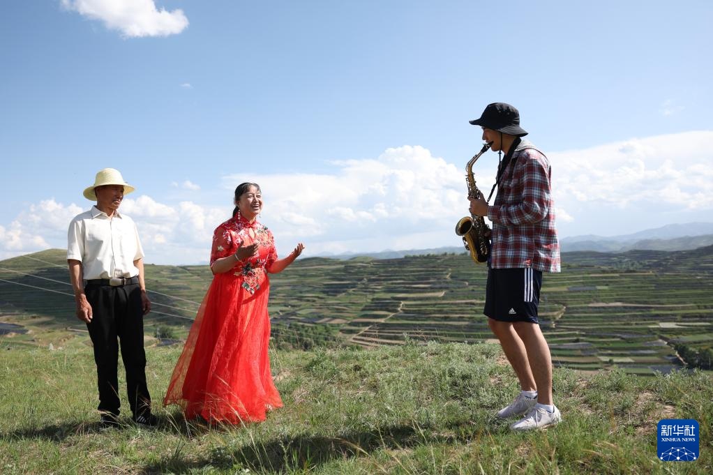 6月11日,在甘肃省定西市岷县二郎山上,“花儿”歌手包小菊(中)与一名萨克斯爱好者对唱交流。