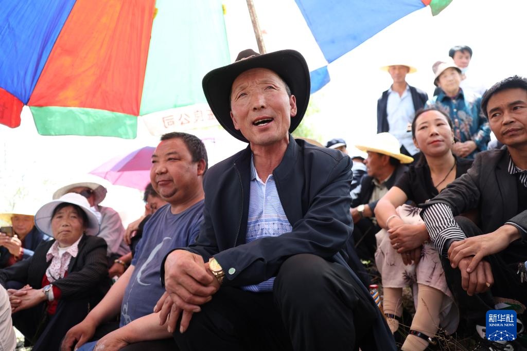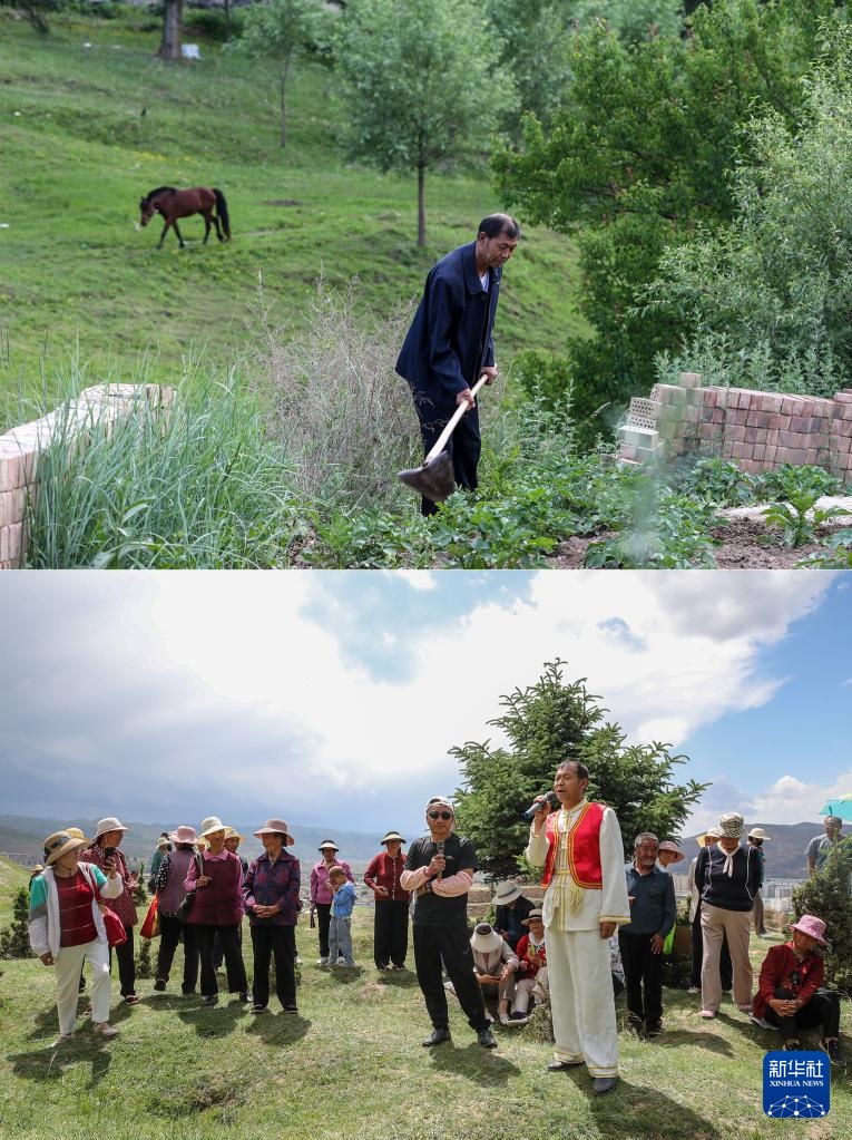 这是一张拼版照片:上图为6月14日,“洮岷花儿”国家级传承人刘郭成在位于甘肃省定西市岷县的自家农田里干活;下图为6月14日,“洮岷花儿”国家级传承人刘郭成(前)在甘肃省定西市岷县二郎山农历五月十九花儿会上唱“花儿”。“花儿”本是田野之歌,乡土气息浓郁,平日埋头田间的歌手,一旦开腔,便神采飞扬,他们用最独特的乡音“声纹”,传达最本真的情感。