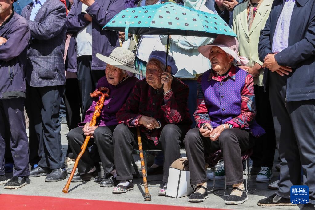 6月13日,3位老人在甘肃省定西市岷县体育公园举行的2025年岷县“花儿”艺术月“花儿”展演活动现场听“花儿”。
