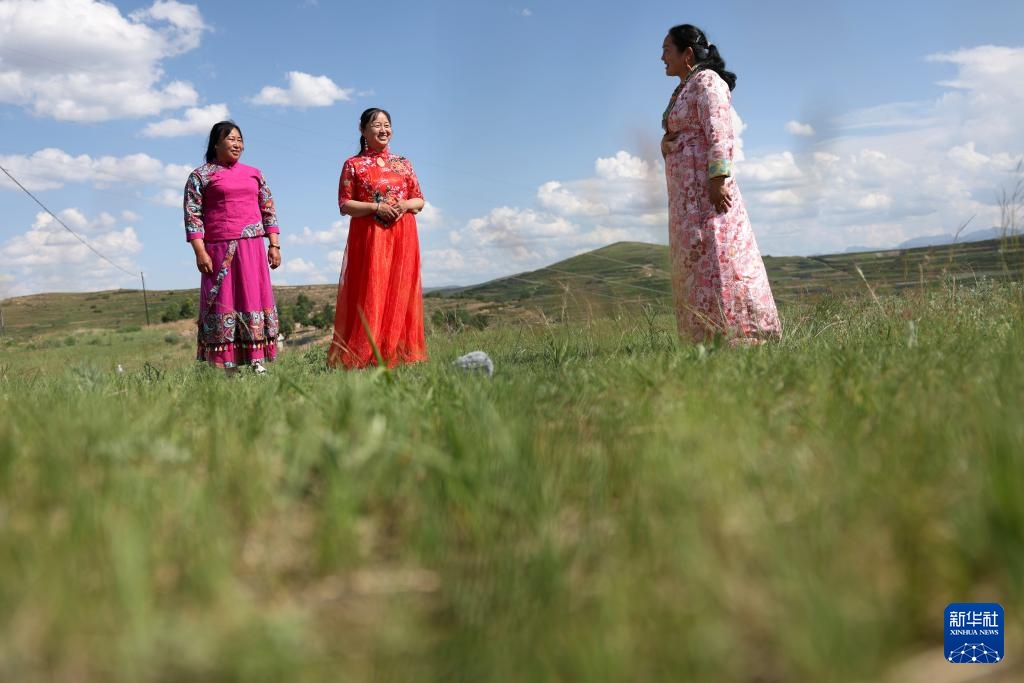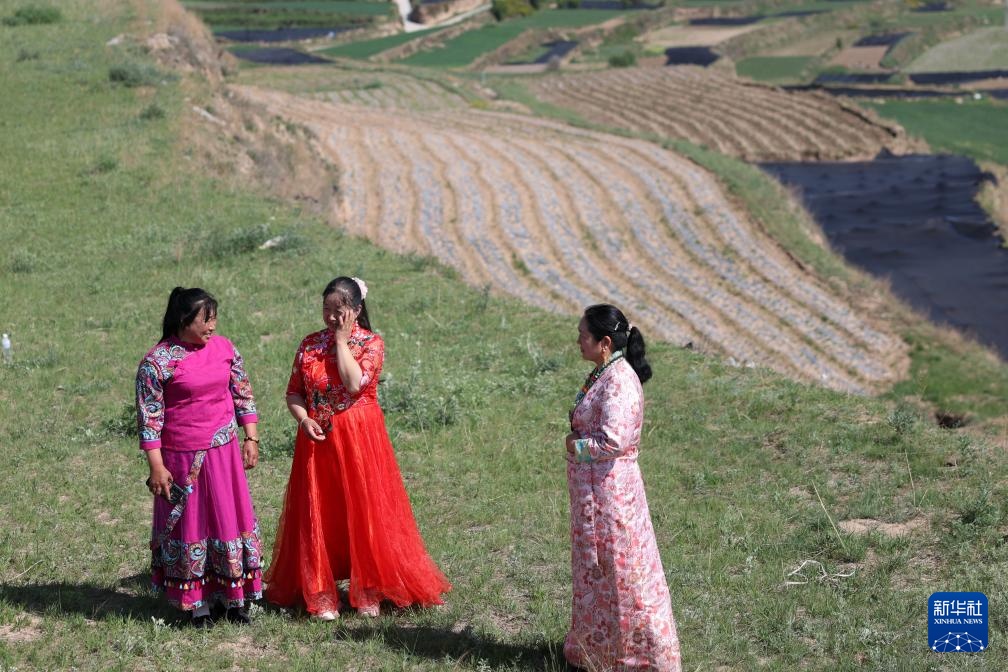 6月11日,“花儿”歌手刘绪桃(左)、包小菊(中)和包兰英在甘肃省定西市岷县二郎山上对唱。