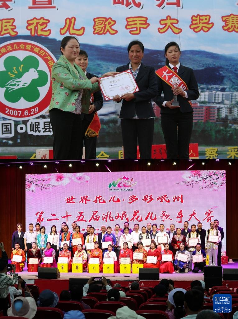 这是一张拼版照片:上图为2007年6月29日在甘肃省定西市岷县拍摄的第七届洮岷“花儿”歌手大奖赛颁奖仪式(岷县县委宣传部供图)。下图为2025年6月11日在甘肃省定西市岷县拍摄的第二十五届洮岷“花儿”歌手大奖赛颁奖仪式(新华社记者郎兵兵摄)。持续举办歌手大奖赛是当地传承保护非遗“花儿”的重要举措之一。