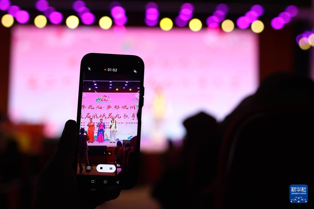 6月11日,在甘肃省定西市岷县,观众用手机拍摄第二十五届洮岷“花儿”歌手大赛。