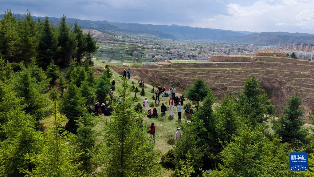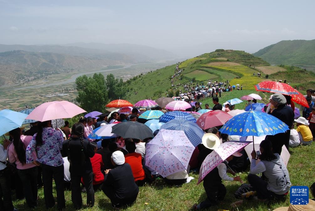 6月14日,人们在甘肃省定西市岷县二郎山上参加一年一度的农历五月十九“花儿会”(无人机照片)。