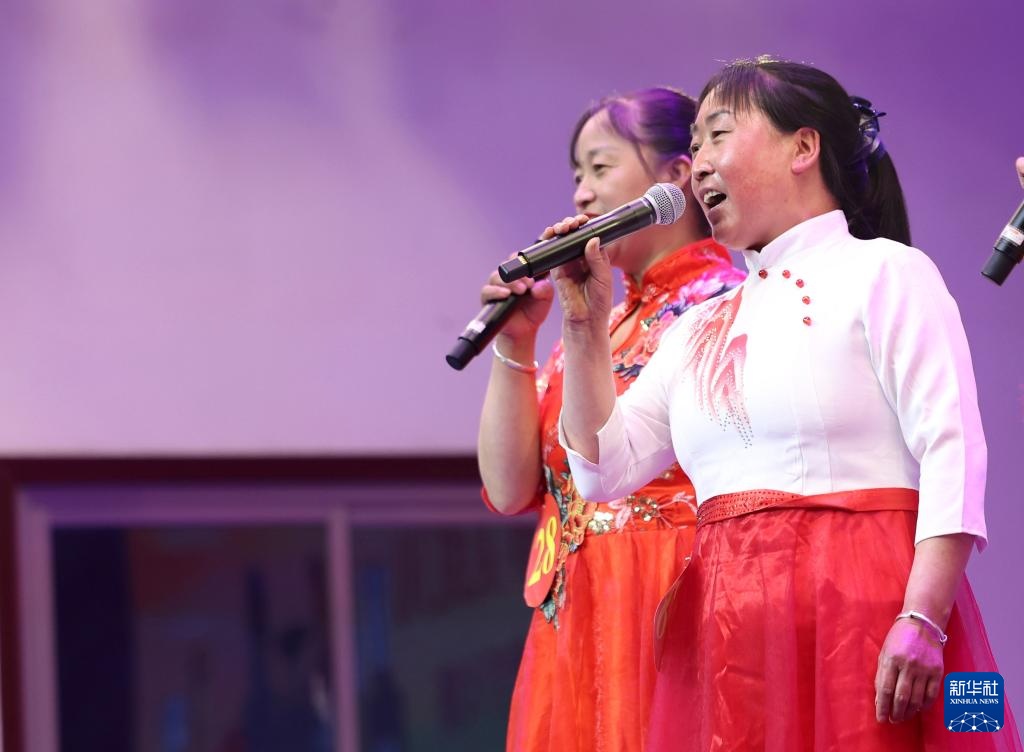 6月11日,在甘肃省定西市岷县举行的第二十五届洮岷“花儿”歌手大赛上,参赛选手刘巧英(右)在进行表演。