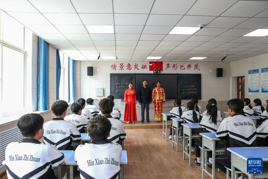 6月13日,在甘肃省定西市岷县职业中等专业学校的“非遗进校园”课堂上,“洮岷花儿”传承人刘郭成(中)携“花儿”歌手为学生们传授“花儿”技艺。