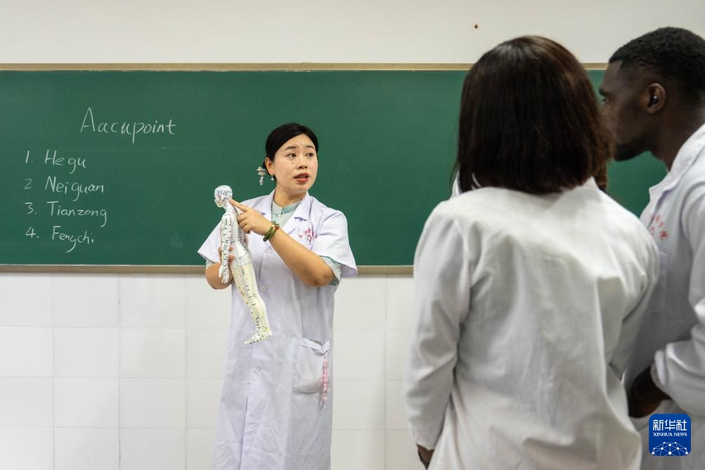 6月19日,长沙医学院中医学教师丁乐(右一)为留学生们讲解针灸技巧。