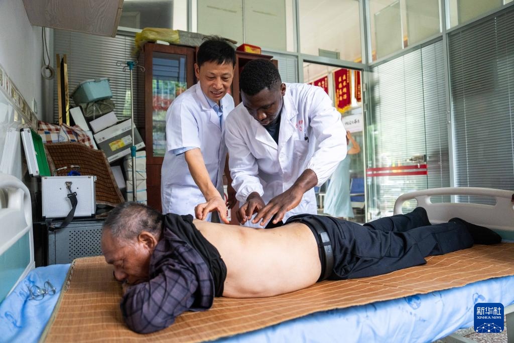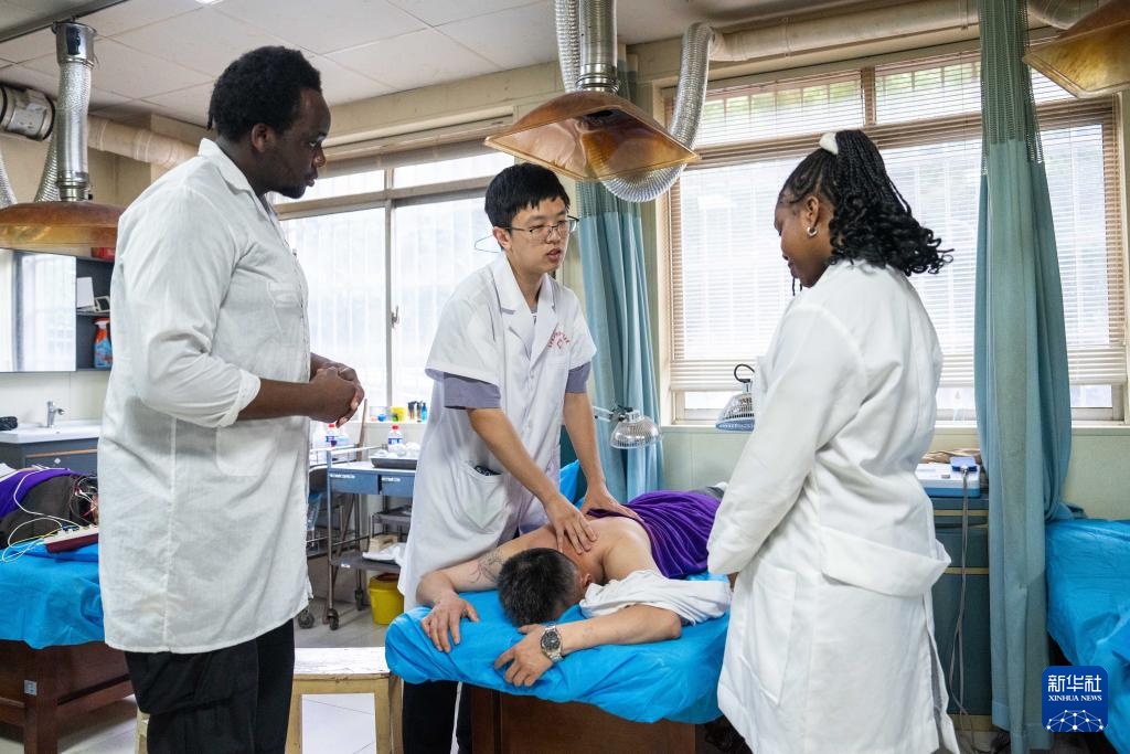 6月18日,在长沙医学院附属第一医院,尼日利亚籍留学生艾明君(右一)与赞比亚籍留学生卡加(左一)学习中医推拿。