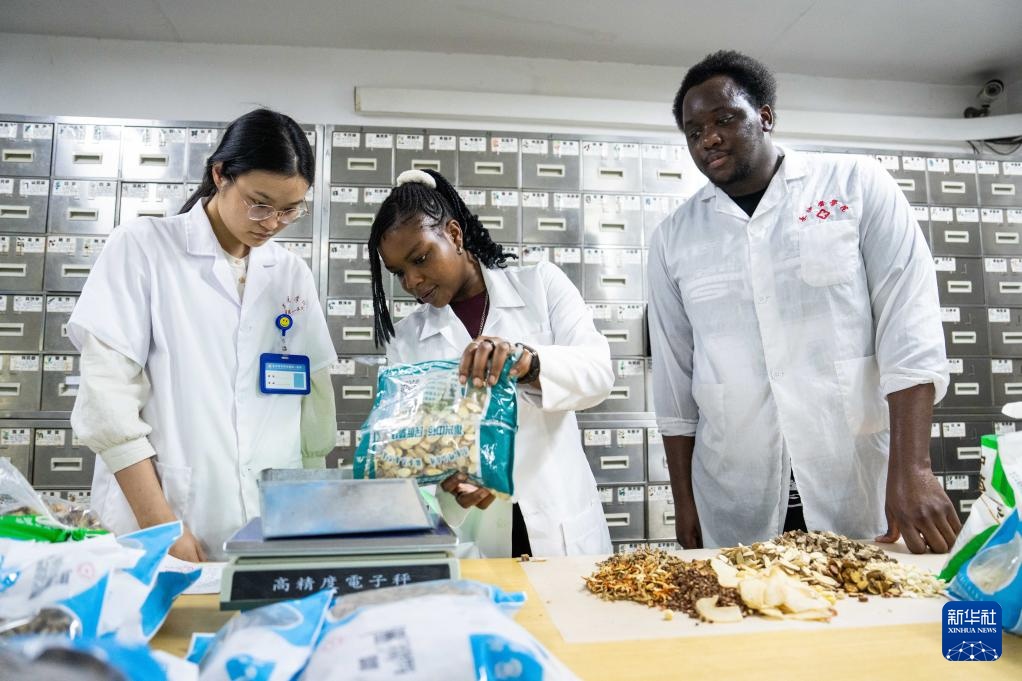 6月18日,尼日利亚籍留学生艾明君(中)在长沙医学院附属第一医院抓中药。