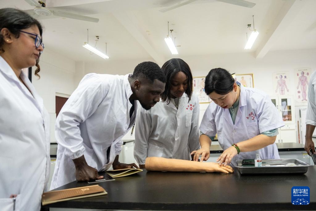 6月19日,在长沙医学院,留学生通过手臂模型练习针灸。