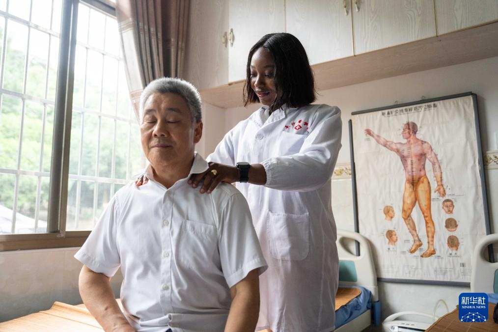 6月18日,在湖南湘江新区金山桥街道金坪社区卫生室,尼日利亚籍留学生罗美慈(右)为社区老人推拿、义诊。