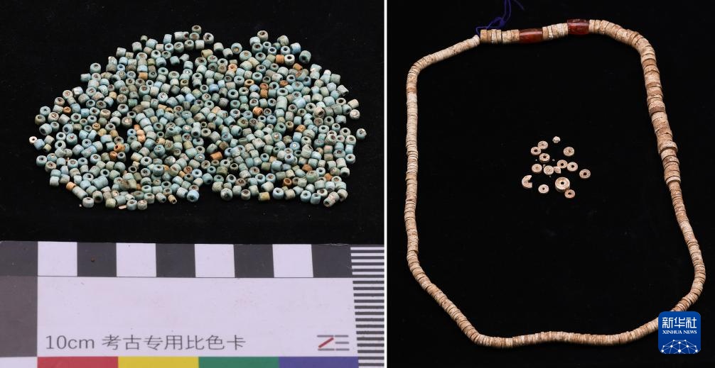 这是玛不错遗址出土的费昂斯珠(左)和带有红玉髓的滑石珠串(拼版照片)。