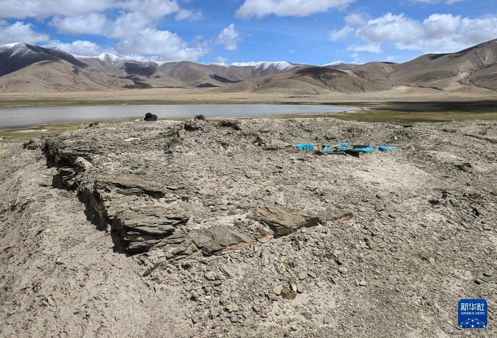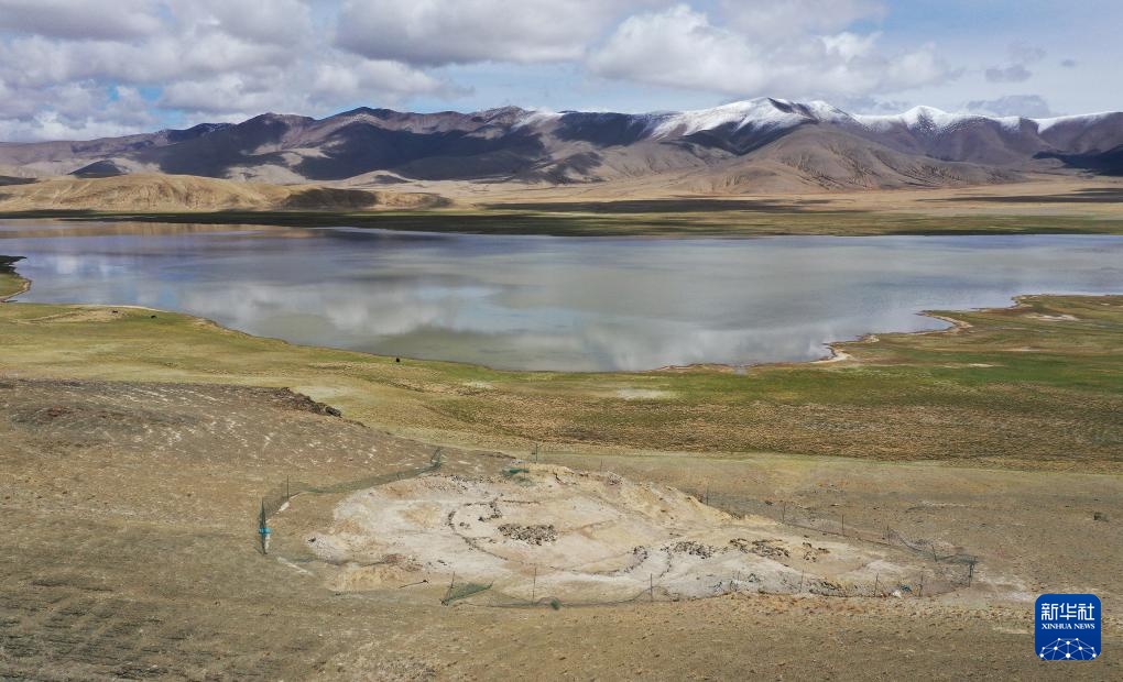 这是5月22日拍摄的坐落在玛不错湖畔的遗址第四期石构地面建筑考古发掘现场(无人机照片)。