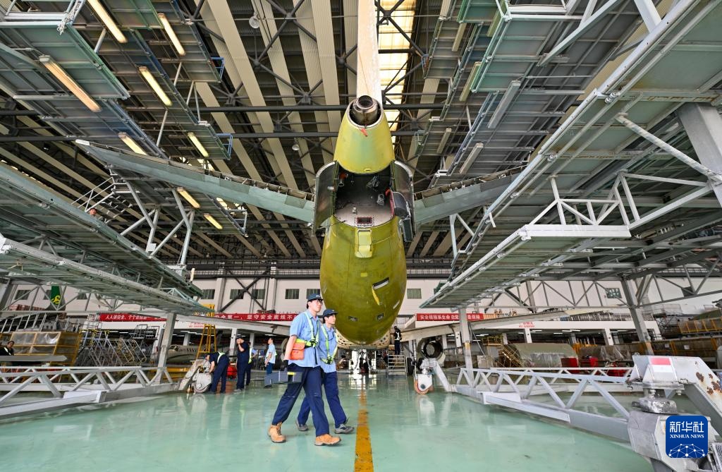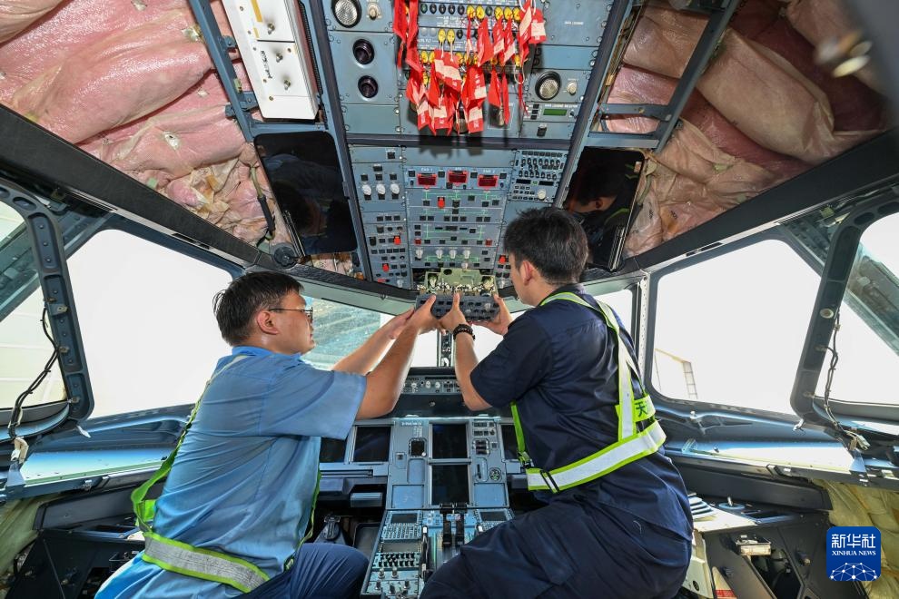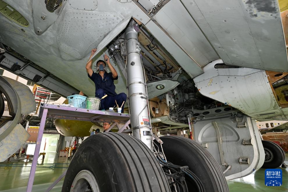 6月18日,在天津自由贸易试验区天津机场片区内的天津海特飞机工程有限公司,工作人员在机库内对飞机进行保税维修。