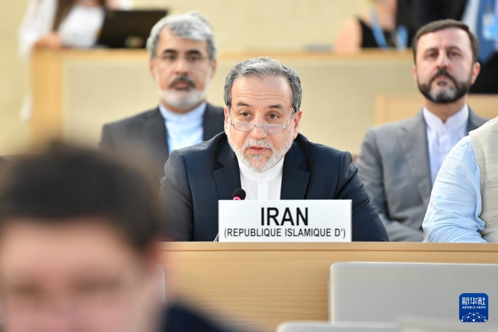 6月20日,在瑞士日内瓦万国宫,伊朗外交部长阿拉格齐(中)在联合国会议上发言。