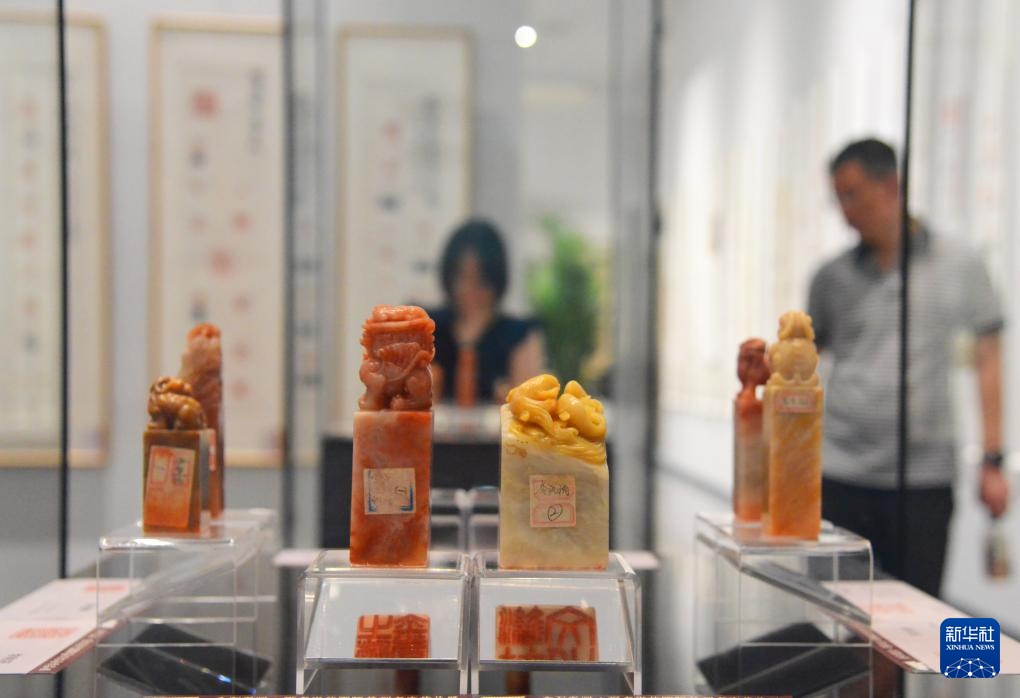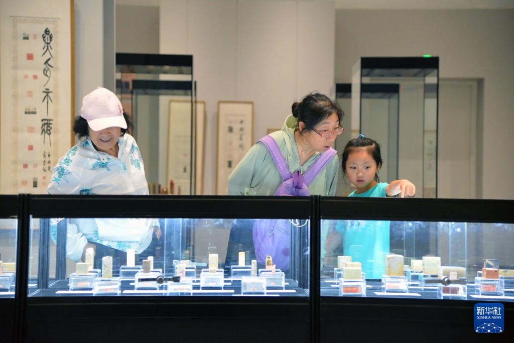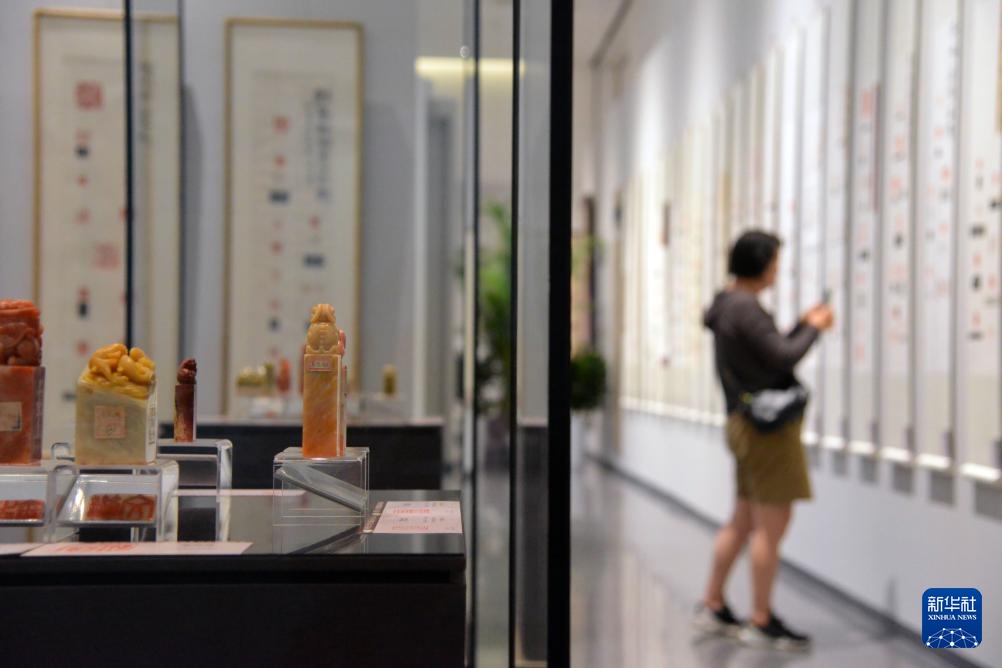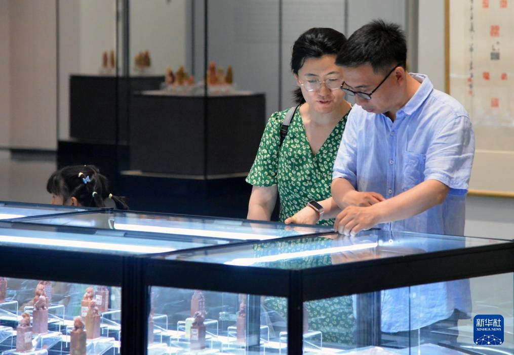 6月21日,观众在北京市海淀区三山五园文化艺术中心参观薪传国粹——“万印楼”新藏当代国际篆刻精品展。
