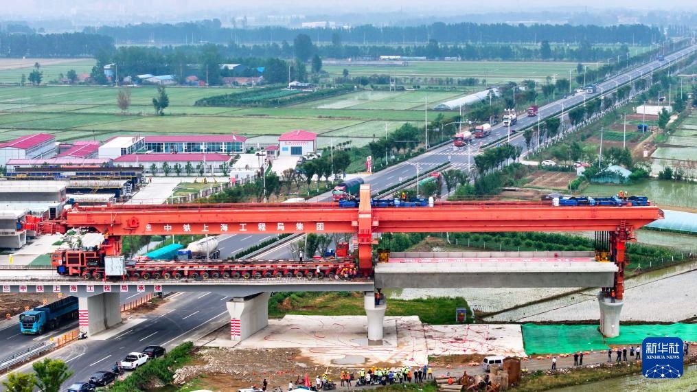 6月21日,在潍宿高铁郯城沭河特大桥施工现场,中铁上海局工作人员在进行箱梁架设(无人机照片)。