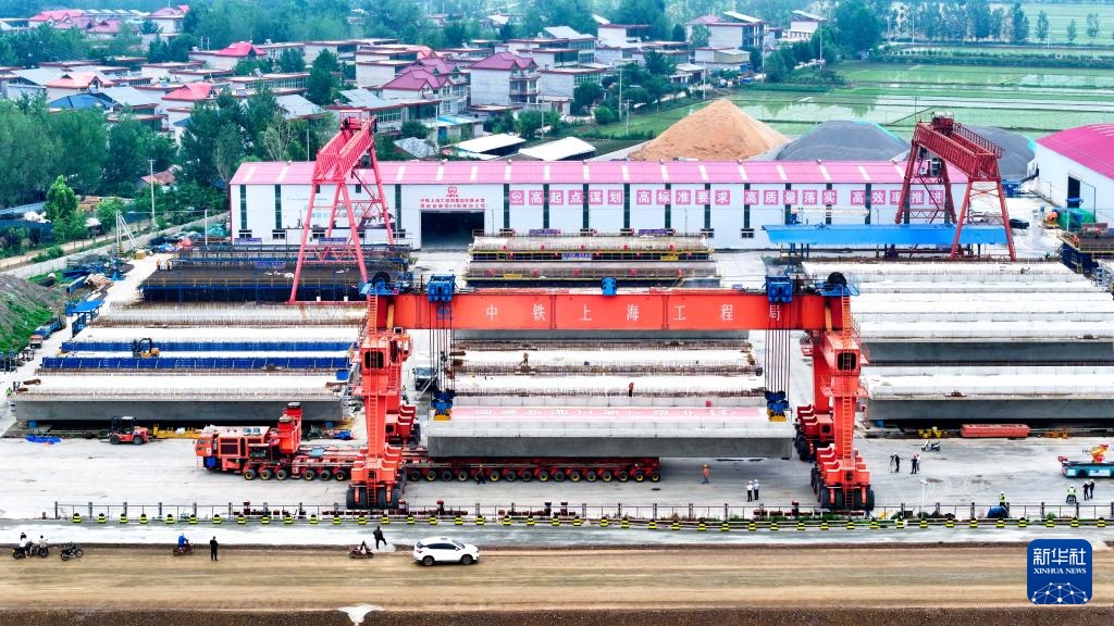 6月21日,在潍宿高铁中铁上海局郯城制梁场,提梁机在提运箱梁(无人机照片)。