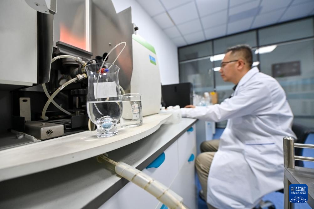 在位于山西省祁县的国家玻璃器皿产品质量监督检验中心,工作人员对玻璃器皿产品的铅镉迁移量进行检测(6月11日摄)。