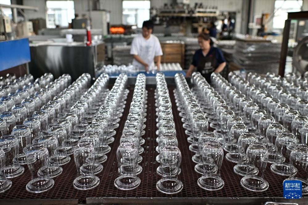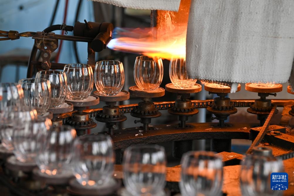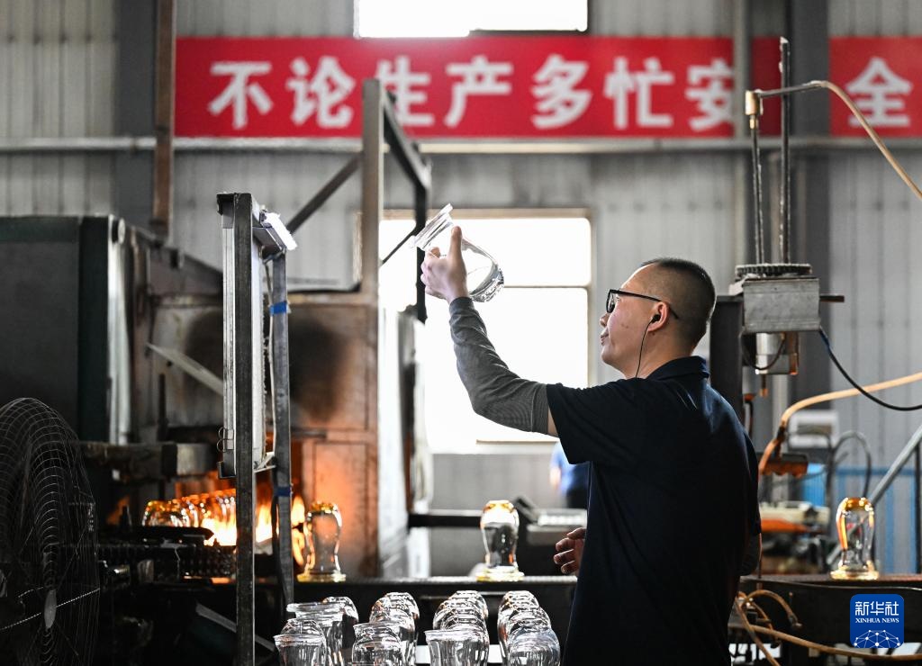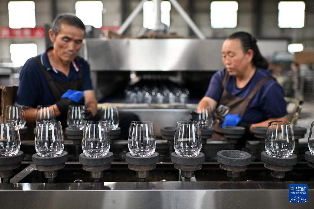位于山西省祁县的山西大华玻璃实业有限公司玻璃器皿生产线一景(6月12日摄)。