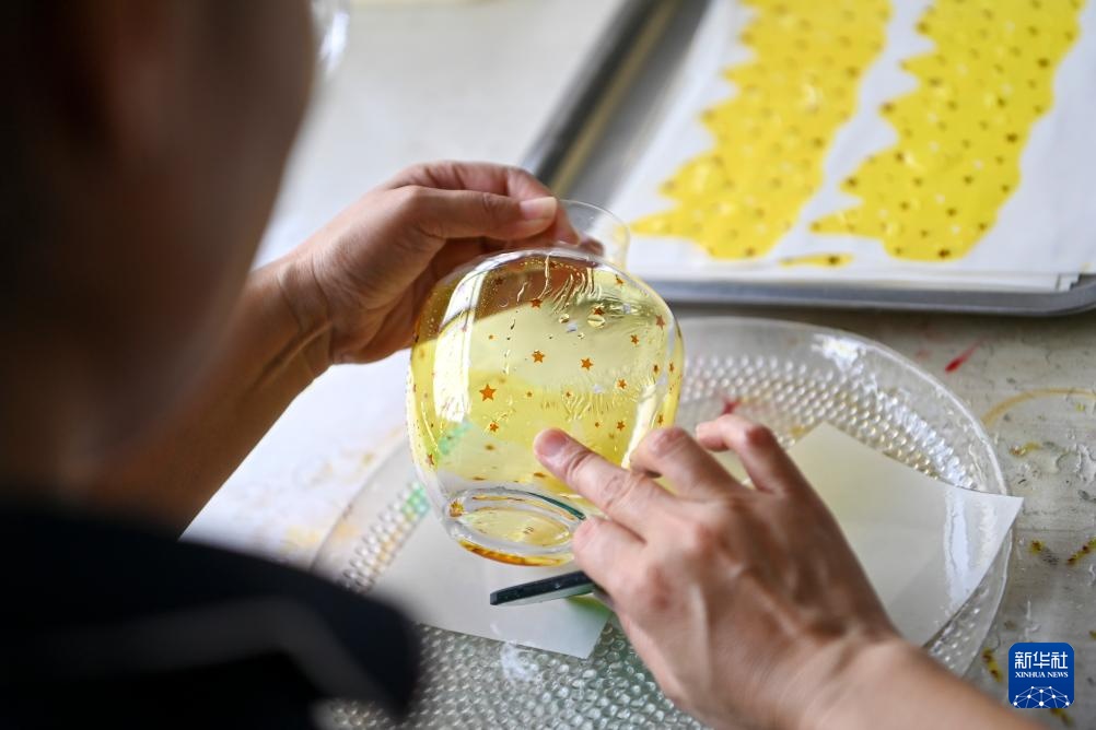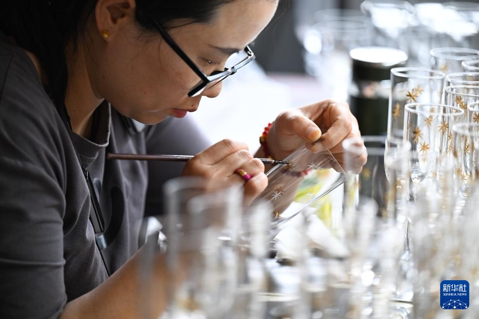 在山西省祁县山西宏艺玻璃器皿有限责任公司,工作人员在玻璃器皿上描绘图案(6月12日摄)。