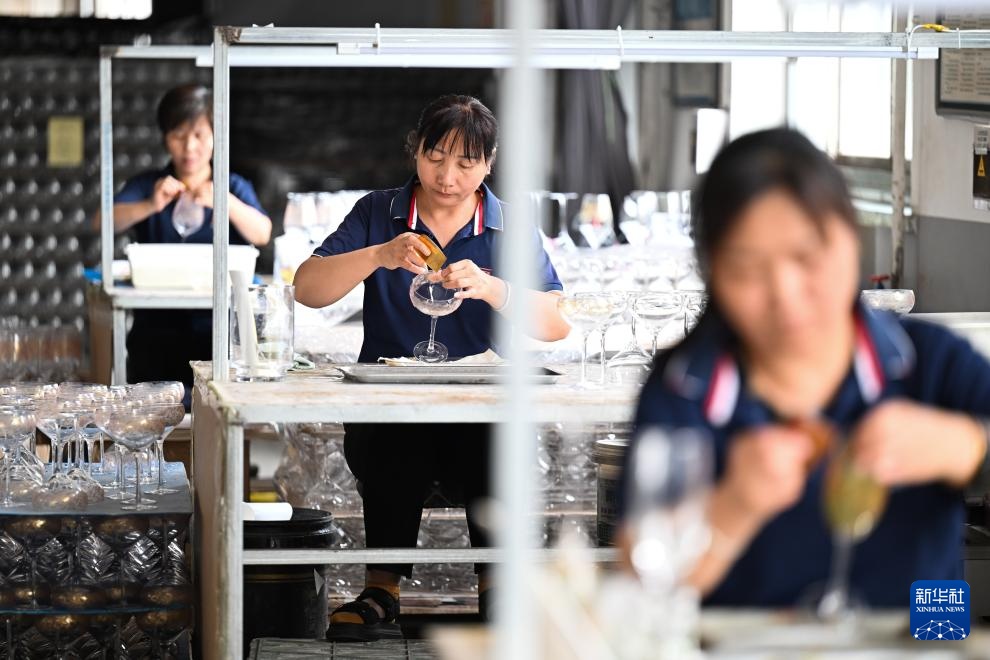 工作人员在山西省祁县山西宏艺玻璃器皿有限责任公司生产线上给玻璃器皿贴花(6月12日摄)。