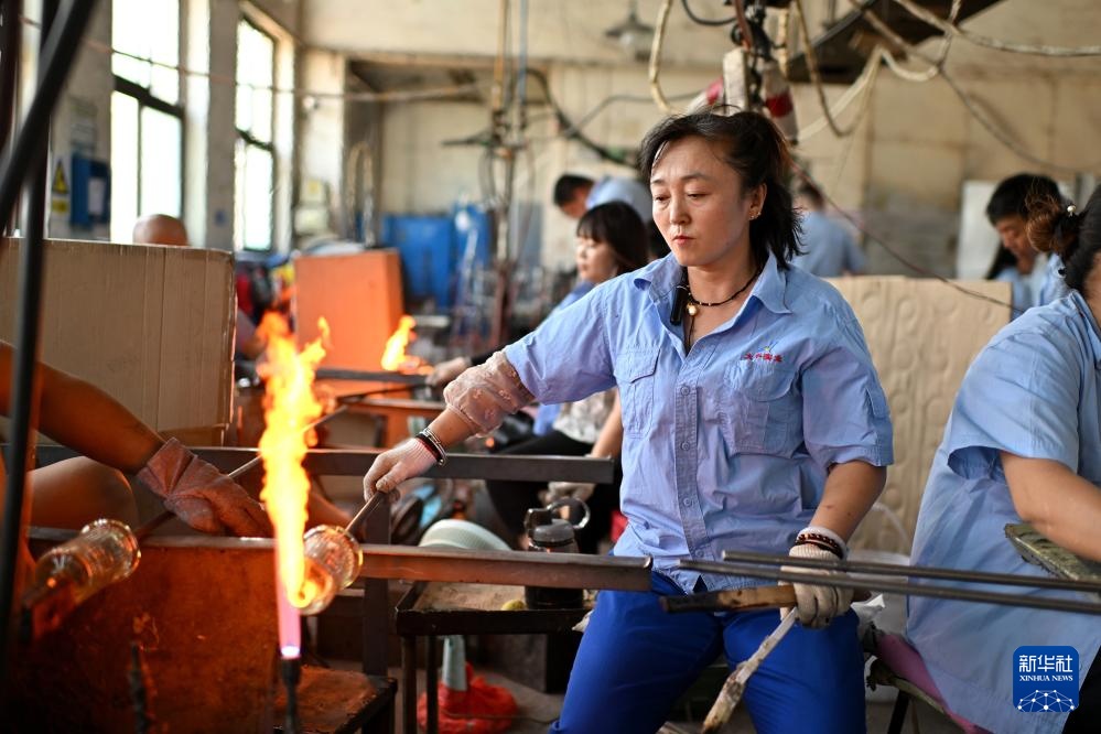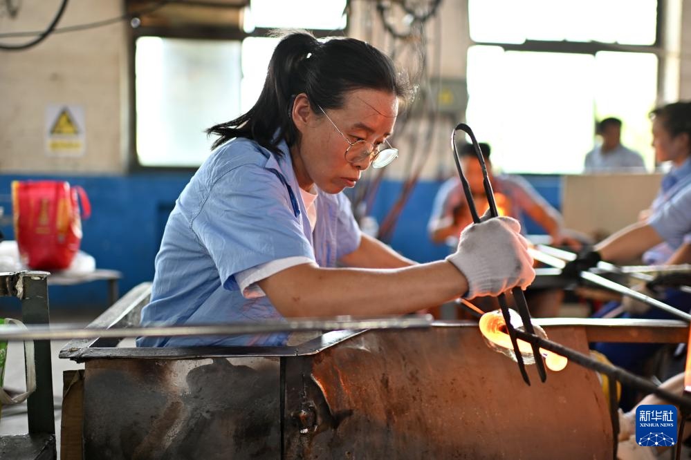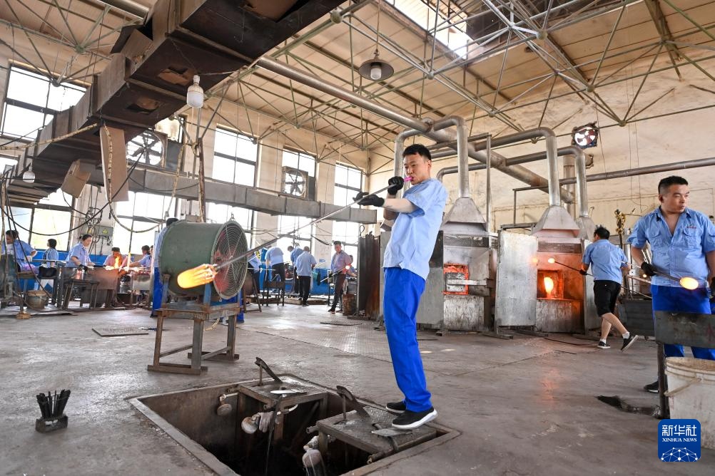 工作人员在山西省祁县山西大华玻璃实业有限公司吹制玻璃器皿(6月12日摄)。