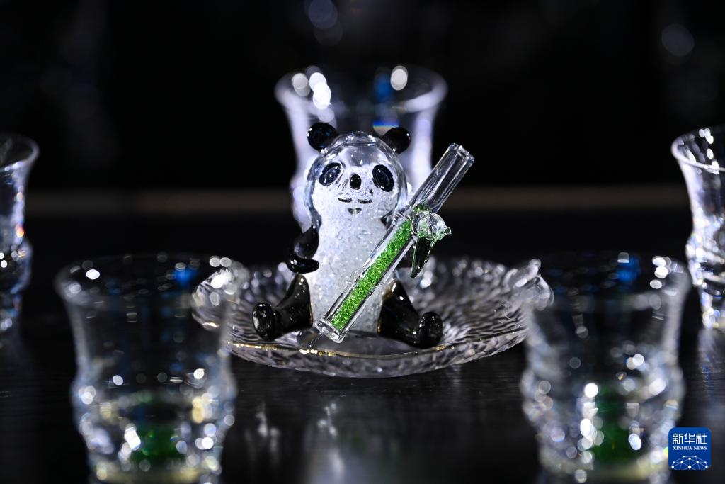这是在位于山西省祁县的“一带一路”合作区规划展示馆拍摄的一款熊猫主题玻璃茶具(6月11日摄)。