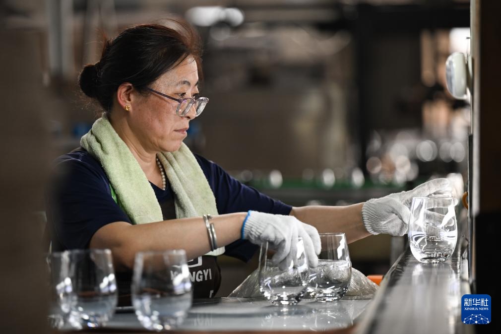 在山西省祁县山西宏艺玻璃器皿有限责任公司,一名工作人员查看玻璃产品是否有瑕疵(6月12日摄)。