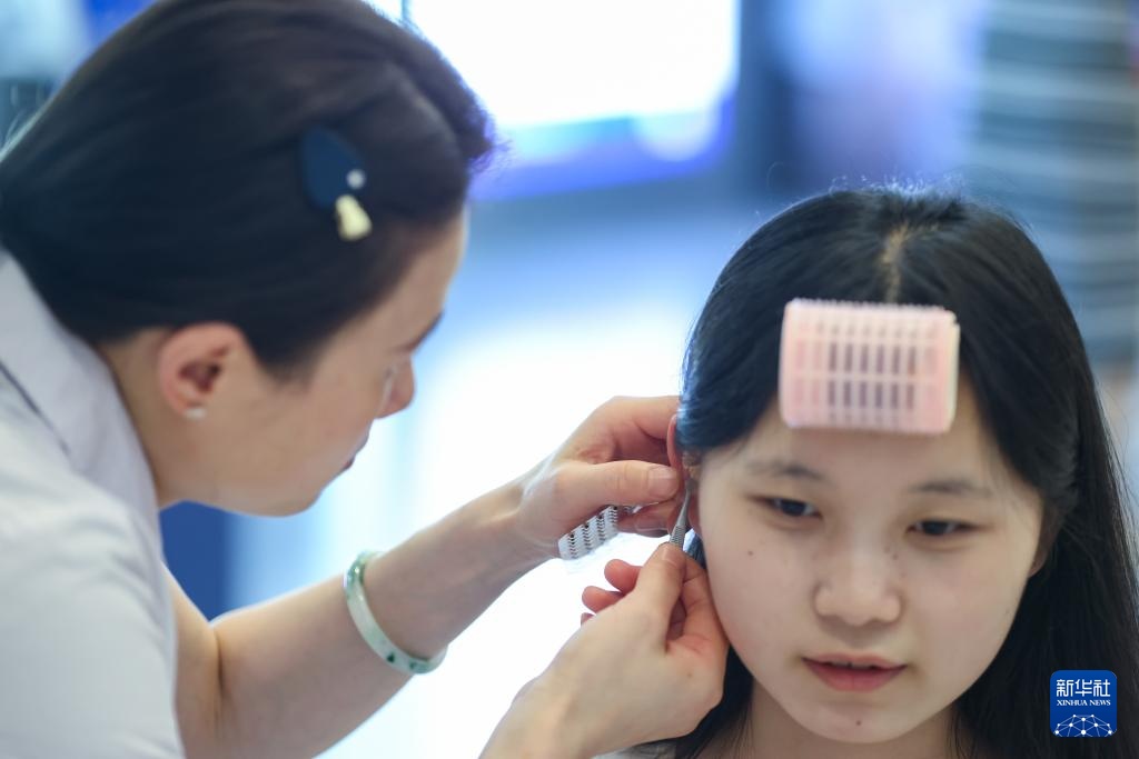 6月21日,在重庆市渝北区大悦城商场,市民在“健康夜市”义诊活动现场体验中医耳穴压豆。