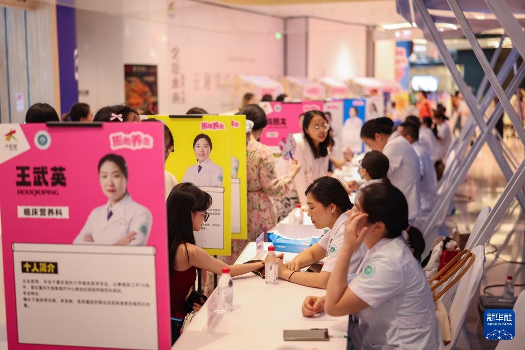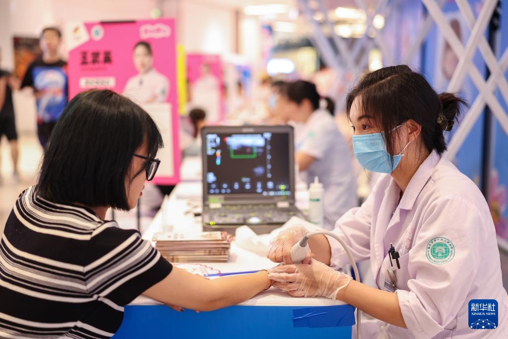 6月21日,在重庆市渝北区大悦城商场,重庆市第十三人民医院的医护人员在“健康夜市”义诊活动现场义诊。