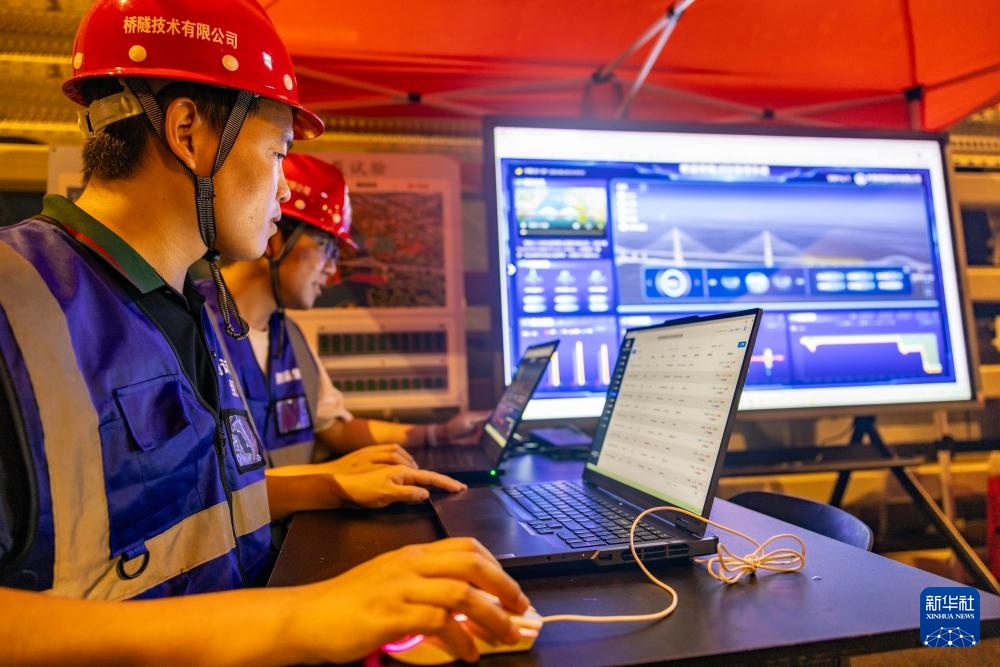 6月20日,工作人员在采集常泰长江大桥荷载试验检测数据。