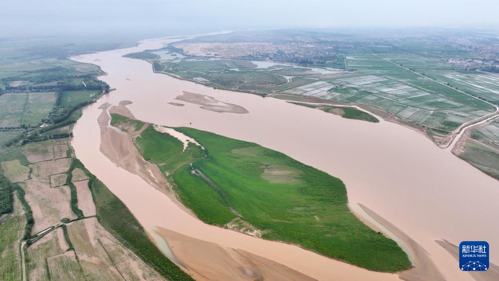 在宁夏贺兰县境内拍摄的黄河滩涂湿地(无人机照片,6月22日摄)。