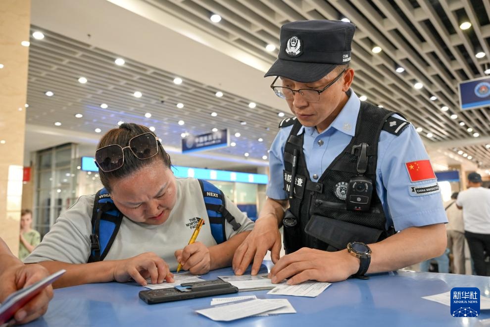 6月22日,二连出入境边防检查站移民管理警察(右)在内蒙古二连浩特公路口岸联检大厅协助旅客填写入境登记卡。