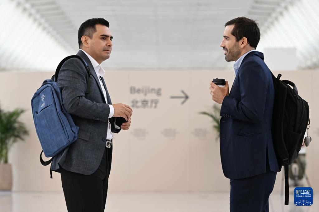 6月24日,两名嘉宾在国家会展中心(天津)论坛会场设置的走廊空间交流。