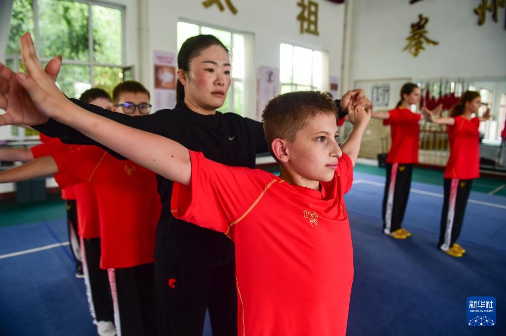 6月25日,在青县八极拳国际训练基地,拳师林天花指导俄罗斯学员练习八极拳。