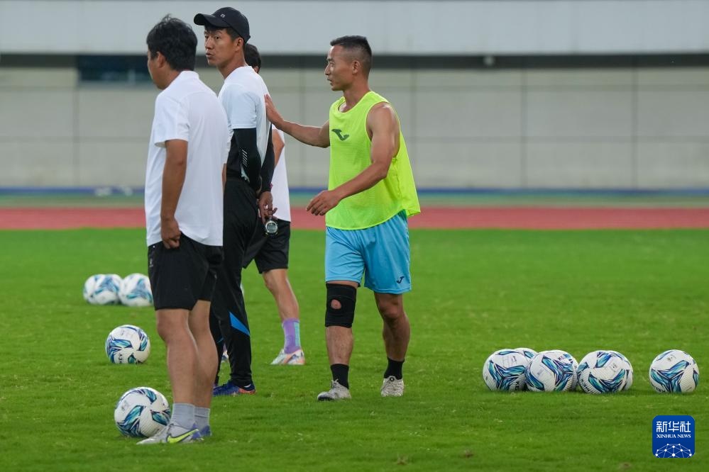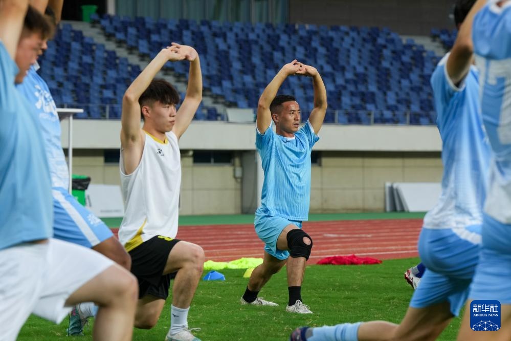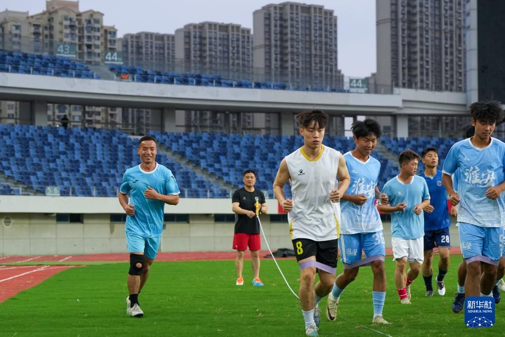 6月23日,戴虎(左一)在淮安奥体中心体育场和队友们进行日常训练。