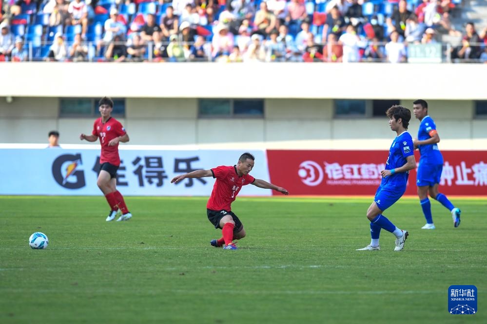 6月14日,淮安队球员戴虎(左二)在2025江苏省城市足球联赛第四轮对阵南京队的比赛中。最终,淮安队主场与南京队1比1战平。