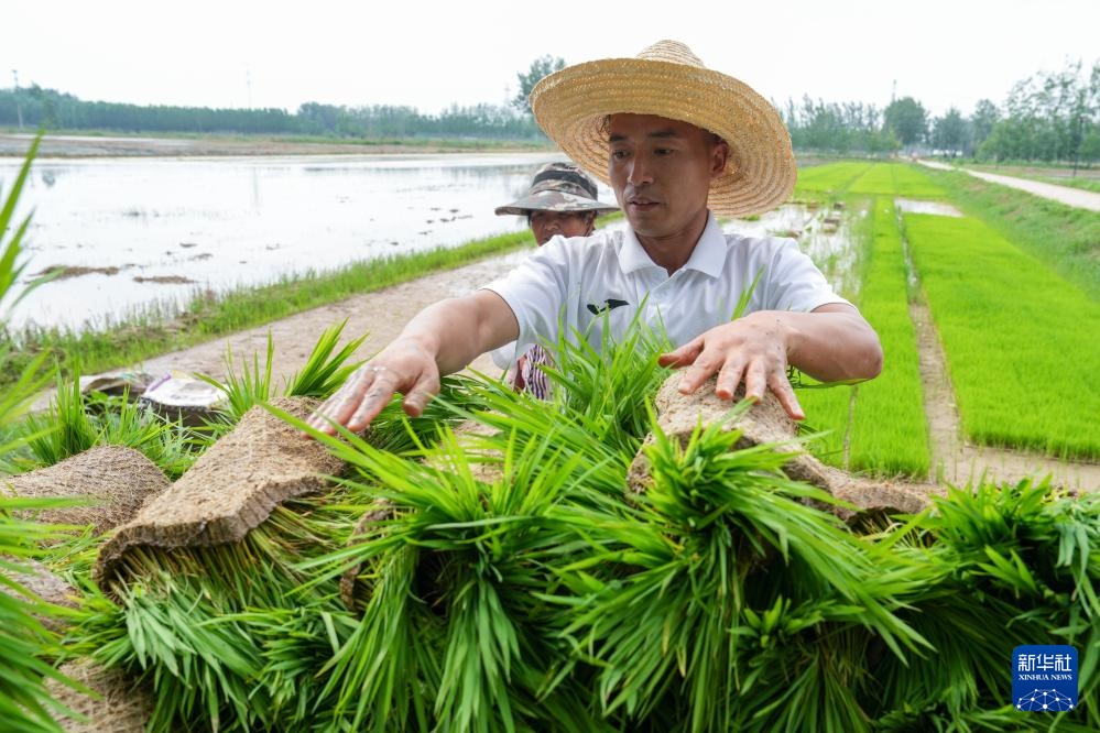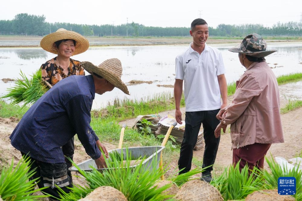 6月23日,戴虎(前)帮助村民搬运水稻秧苗。