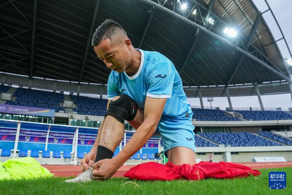 6月14日,淮安队球员戴虎(右)在2025江苏省城市足球联赛第四轮对阵南京队的比赛中。最终,淮安队主场与南京队1比1战平。