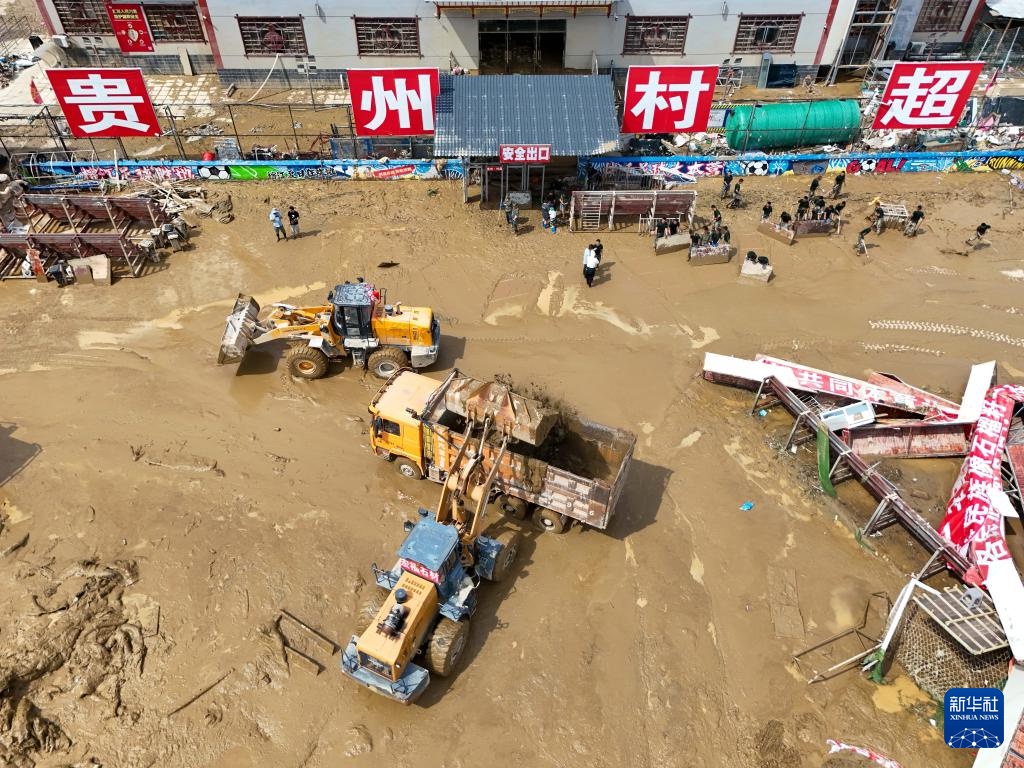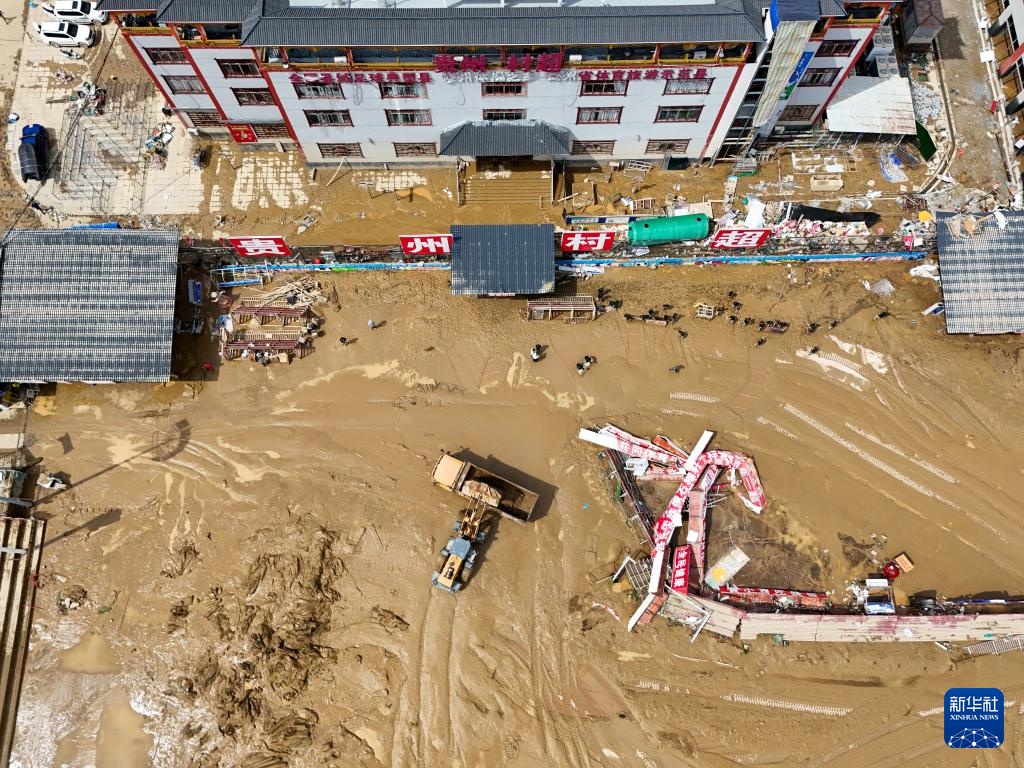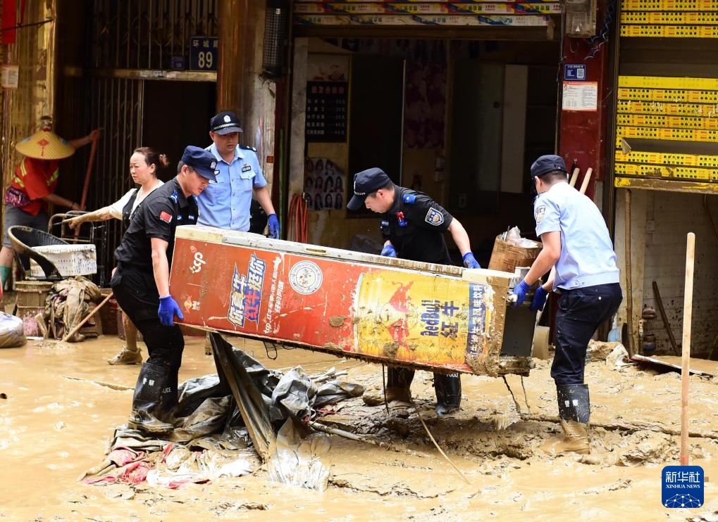 6月25日,在贵州省从江县城区,人们在清理街道淤泥。