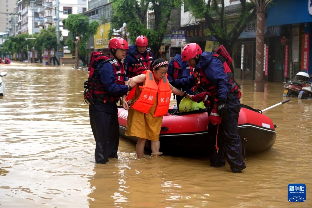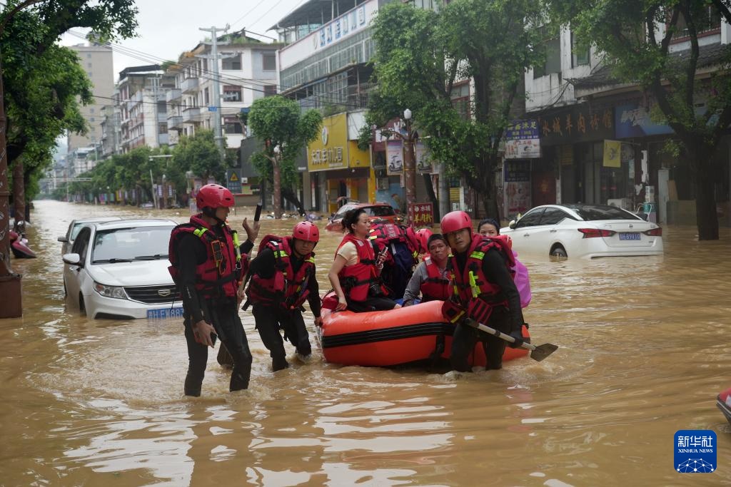 6月24日,在贵州省榕江县城,工作人员在转移群众。