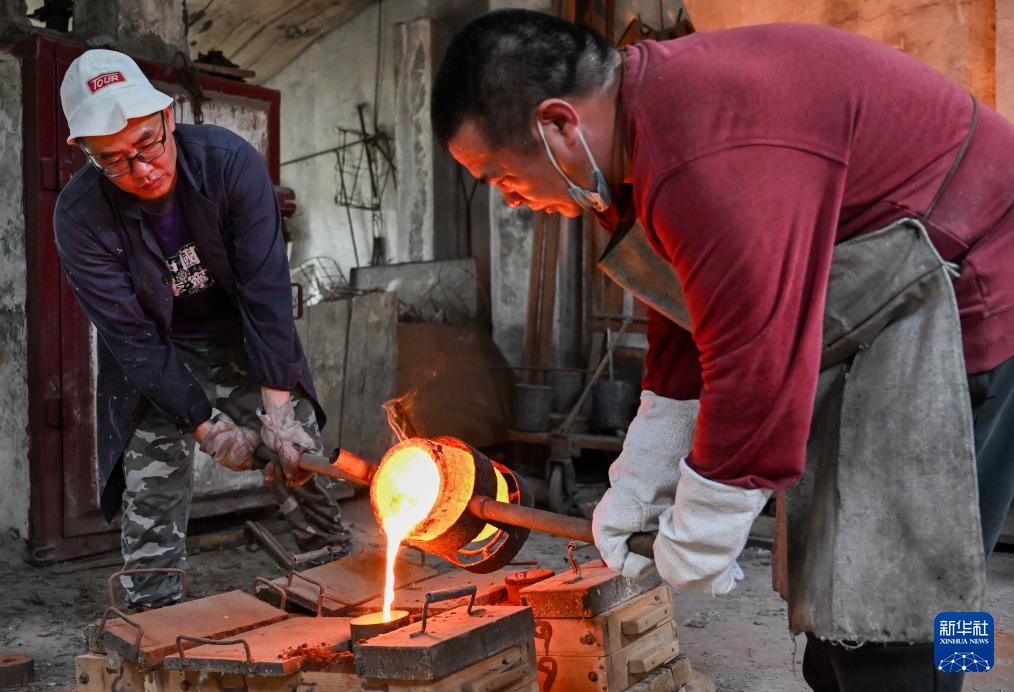 6月17日,在荆州市公安县埠河镇,敖兴华(右)和弟弟在工作坊内进行铜水浇铸。