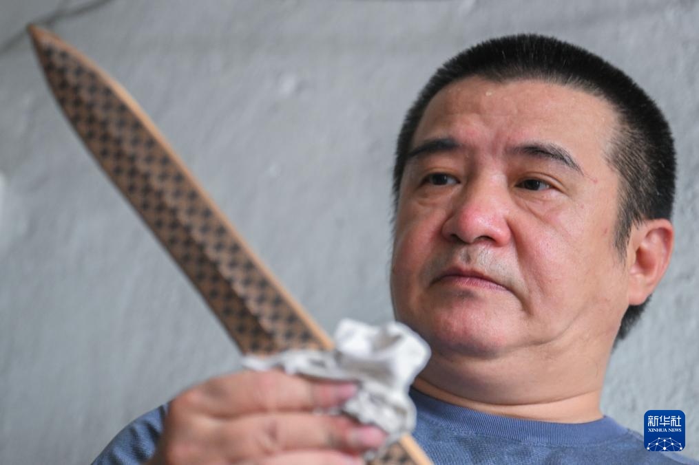6月16日,在荆州市公安县埠河镇,敖兴华在工作坊内镶嵌剑格。
