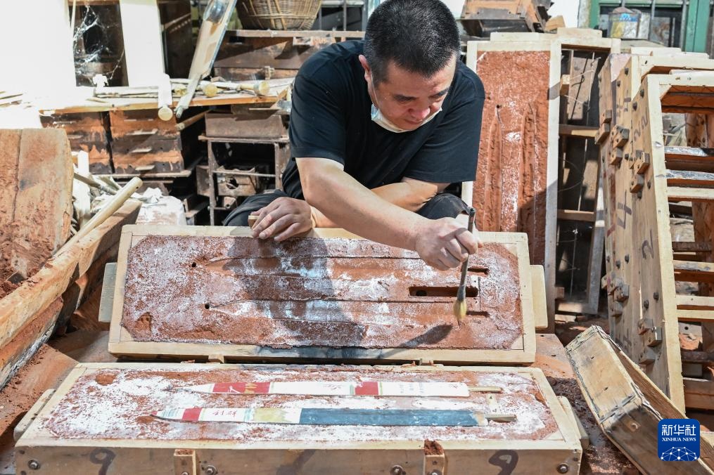 6月16日,在荆州市公安县埠河镇,敖兴华在工作坊内擦拭模具。